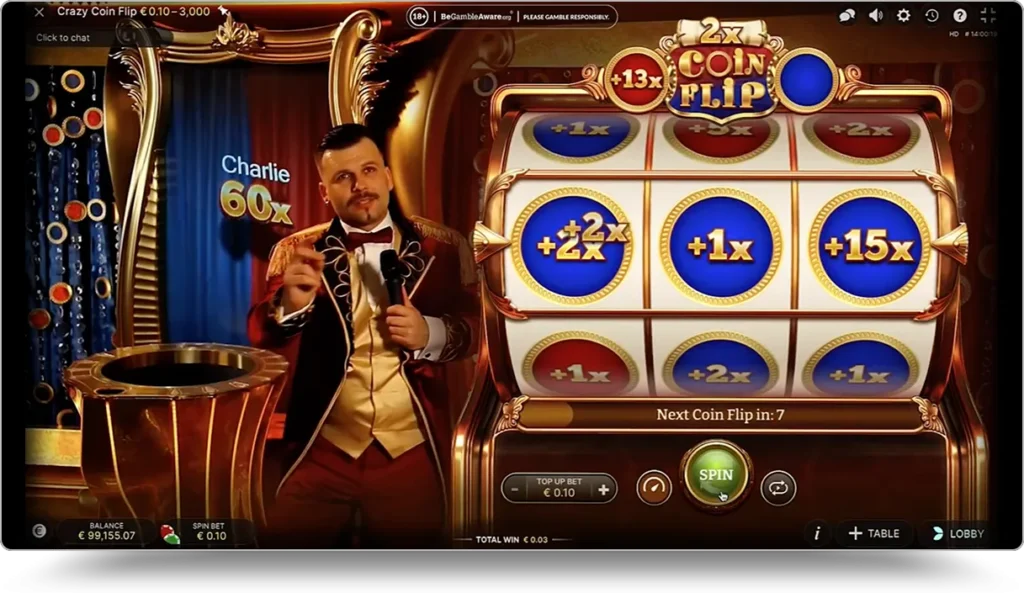 Coin Flip est le jeu bonus le plus fréquent, avec 4 segments sur la roue, soit une probabilité plus élevée de l’obtenir par rapport aux autres bonus. Inspiré du classique pile ou face, ce mini-jeu repose sur un lancer de pièce comportant deux faces : rouge et bleu.
