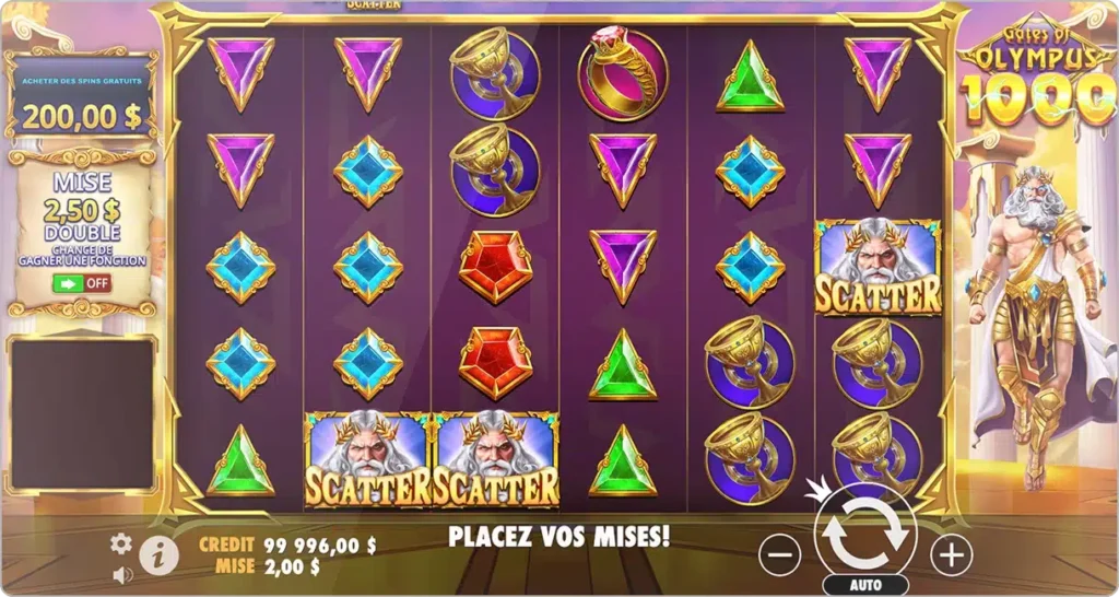Gates of Olympus™ est une slot à forte volatilité, lancée en 2021 par Pragmatic Play. Le décor de cette machine à sous s’inspire de la mythologie grecque, avec Zeus en figure centrale. Le jeu se présente sous la forme d’une grille 6×5, avec un système de revenus en cascade. Les symboles gagnants disparaissent à chaque spin, laissant place à de nouveaux.